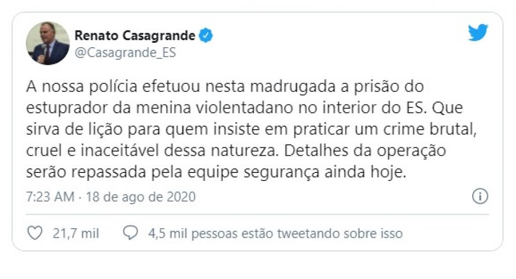A nossa polícia efetuou nesta madrugada a prisão do estuprador da menina violentada no no interior do ES. Que sirva de lição para quem insiste em praticar um crime brutal, cruel e inaceitável dessa natureza. Detalhes da operação serão repassada pela equipe segurança ainda hoje”, escreveu o governador em sua página.