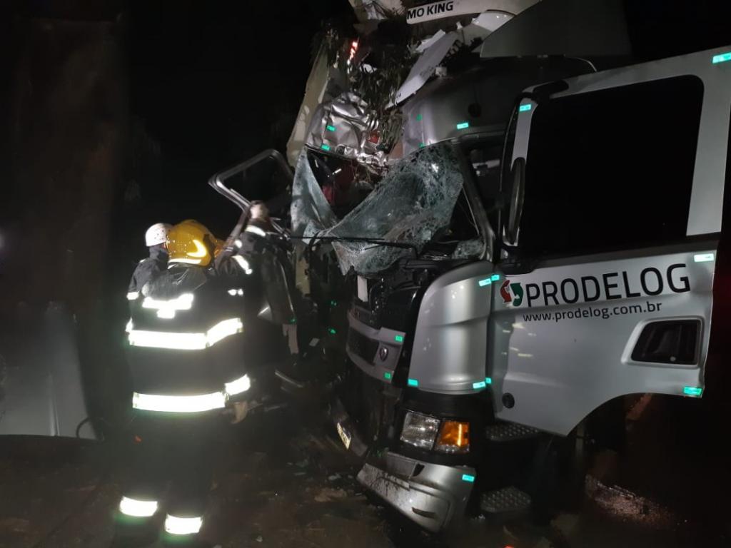 Com o forte impacto da colisão, a frente do caminhão ficou completamente destruída. Bombeiros Militares tiveram trabalho para o desencarceramento da vítima que foi a óbito.