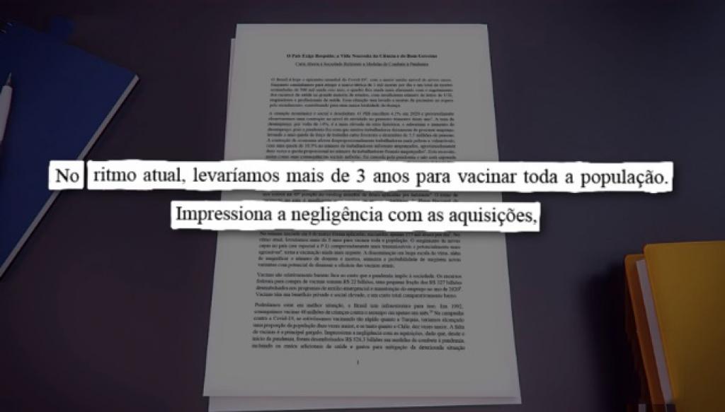 A carta lembra que a saída definitiva da crise requer a vacinação em massa da população.” Que infelizmente, estamos atrasados. Que no ritmo atual, levaríamos mais de três anos para vacinar toda a população. E que impressiona a negligência com as aquisições”.