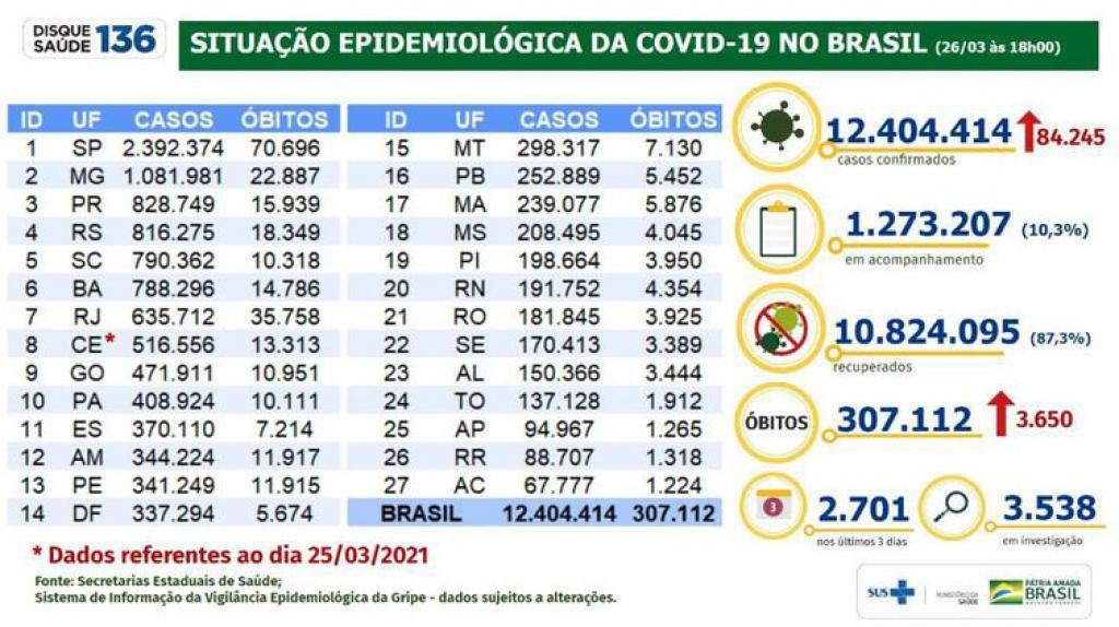 Os dados estão na atualização do Ministério da Saúde divulgada na noite desta sexta-feira (26). O balanço é produzido com as informações coletadas pelas autoridades estaduais e locais de saúde.