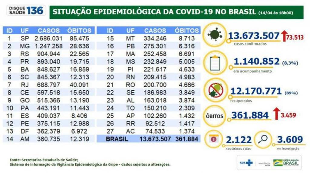 A soma de casos acumulados foi para 13.673.509. Entre ontem e hoje, foram confirmados 83.513novos diagnósticos positivos. Ontem, a quantidade de casos acumulados até o momento estava em 13.599.994.