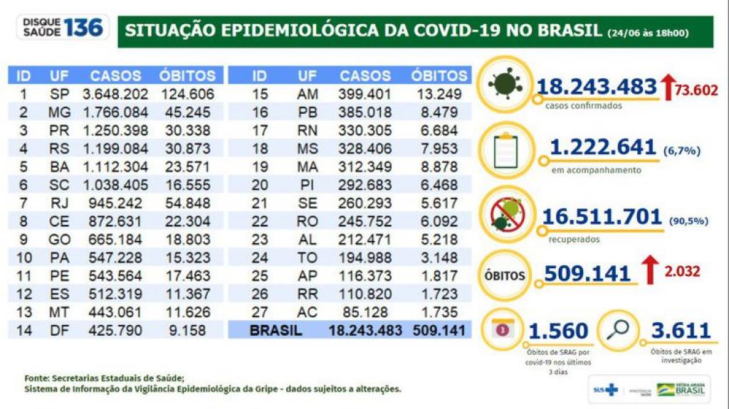 Já a soma de vidas perdidas para a pandemia alcançou 509.141. Entre ontem e hoje (24), foram registradas 2.032 novas mortes por covid-19. Ontem, o número de pessoas que perderam a vida em função de complicações vinculadas à doença estava em 507.109.
