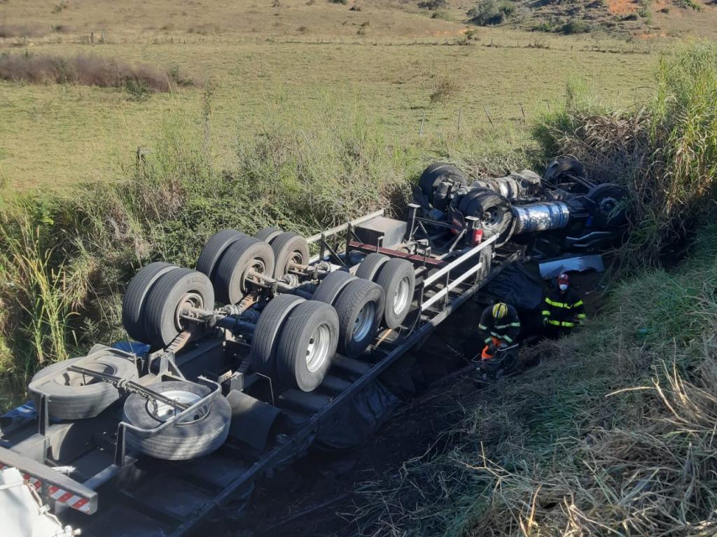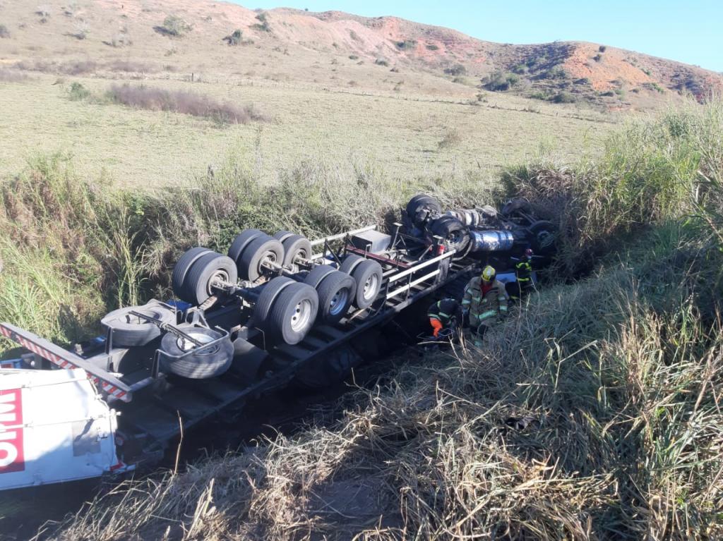 Conforme dados do Corpo de Bombeiros Militar, a equipe do 11º Batalhão de Ipatinga constatou, no local, que o caminhão trator saiu da pista levando a carreta que tracionava e desceu em um barranco por aproximadamente 10 metros e parou com as rodas para cima.