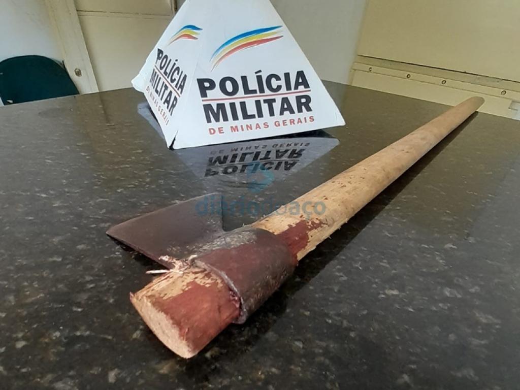 O machado utilizado no homicídio, ainda sujo de sangue da vítima, foi apreendido pelos policiais militares