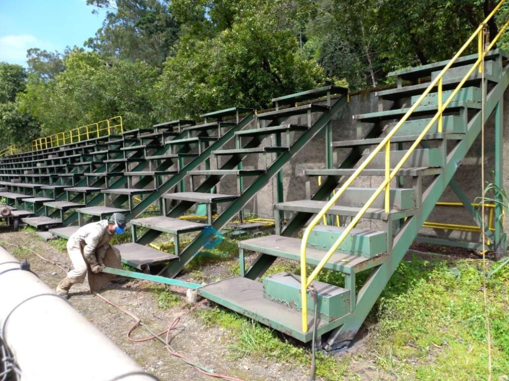 Funcionário de uma sucataria nos trabalhos de retirada das arquibancadas instaladas pela Usiminas na década de 1970 Instaladas desde os tempos do estádio da Alameda, da antiga Associação Atlética Aciaria, no bairro Cariru, as arquibancadas que por último serviam ao campo principal (batizado com o nome de Sergio Leite de Andrade, presidente da Usiminas) foram retiradas do local, por ordem da direção do Ipatinga Futebol Clube. O destino das ferragens pode ter sido uma sucataria da cidade, que teria adquirido o material a valores de sucatas de metal.