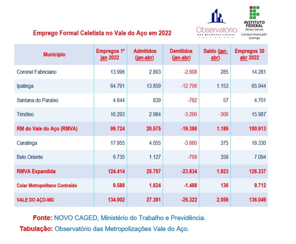 Com a divulgação dos resultados de abril do Novo Caged (Cadastro Geral de Empregados e Desempregados) pelo Ministério do Trabalho e Previdência, o Observatório das Metropolizações Vale do Aço, instalado no IFMG Ipatinga, consolidou os dados do mercado de trabalho do primeiro quadrimestre (janeiro a abril) de 2022, exclusivamente para o Diário do Aço. No total, foram gerados 2.059 empregos com carteira assinada em toda a Metropolização, dos quais, 1.189 na Região Metropolitana oficial (RM), 1.923 na Região Metropolitana Expandida (RME) e 136 no Colar Metropolitano Contraído (CMC), de acordo com a tabulação e os cálculos do geógrafo William Passos, que também integra a Rede Observatórios do Trabalho, do Observatório Nacional do Mercado de Trabalho do Ministério do Trabalho e Previdência.