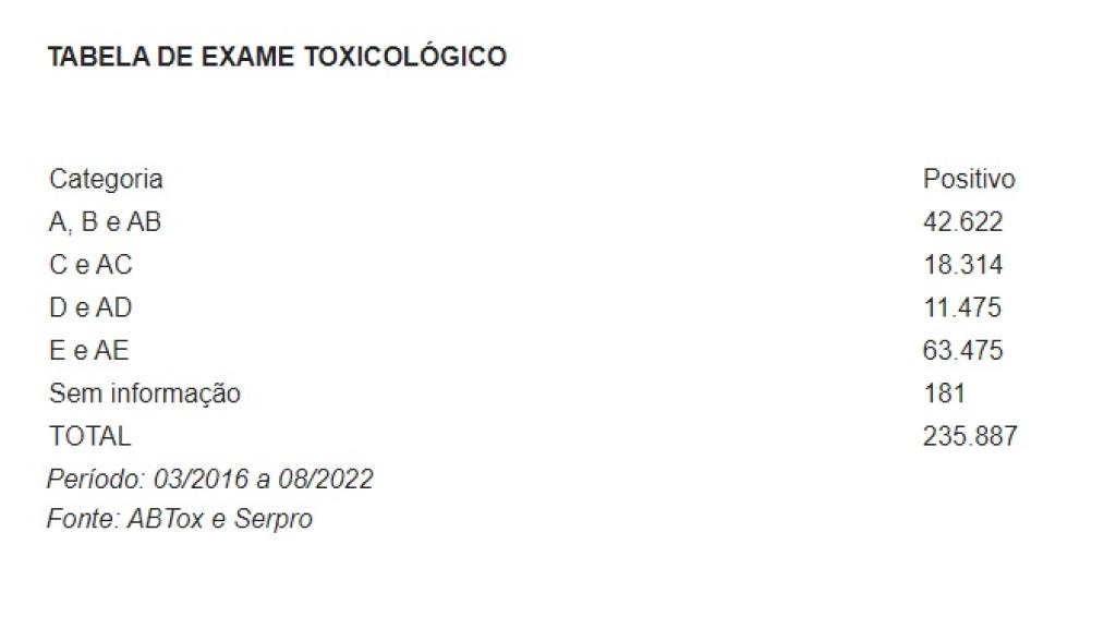 Em outro levantamento realizado pelo SOS Estradas, comparando o número de condutores habilitados nas categorias C, D e E, em dezembro de 2015, último ano em que o exame não era obrigatório, e dezembro de 2021, revelou queda no número de motoristas habilitados nessas categorias de mais de quatro milhões, considerando a projeção de crescimento do período. É a chamada positividade escondida, quando o motorista decide não fazer o exame e perde a habilitação porque sabe que não passaria no exame”, explica Rizzotto.