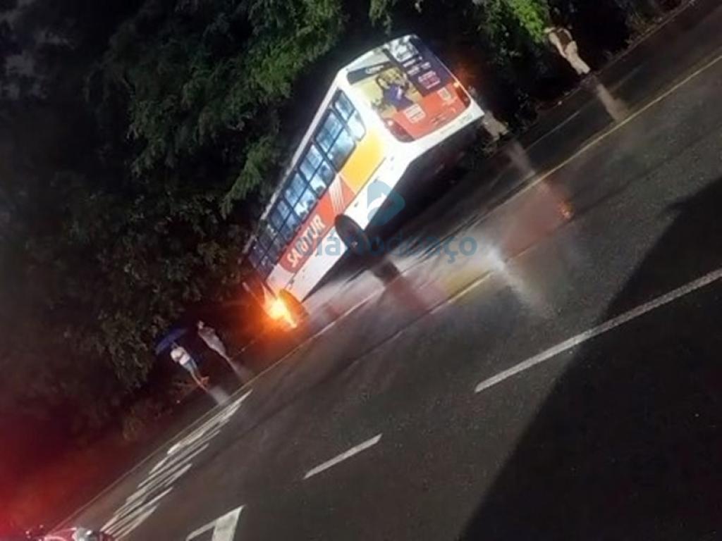O motorista e uma passageira saíram feridos levemente após a colisão de um ônibus da empresa Saritur contra uma árvore à margem da avenida Kiyoshi Tsunawaki, entre os bairros Cariru e das Águas, em Ipatinga. O coletivo derrapou na pista, em uma curva, quando trafegava na noite de terça-feira (1).