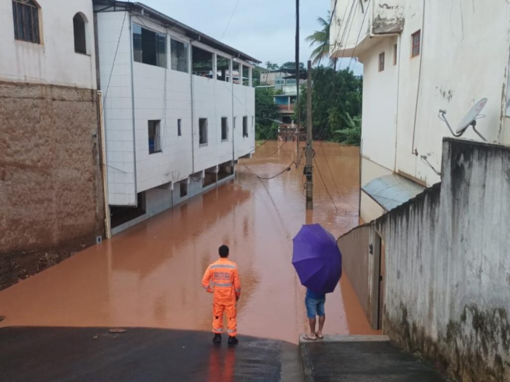 Bombeiros monitoram situação de córrego que transbordou, inundou repentinamente rua em Naque e deixou isolados moradores de dois prédios