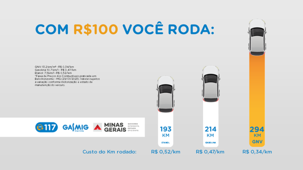 Uma simulação realizada por técnicos da Gasmig, levando em consideração a queda no preço do GNV, e, considerando o recente aumento no preço do etanol e da gasolina, mostra que o GNV continua sendo o combustível mais econômico. Mesmo com a continuidade do incentivo para o ICMS da gasolina e do etanol, o GNV segue apresentando o maior rendimento e custo por km rodado, entregando economia para os usuários.