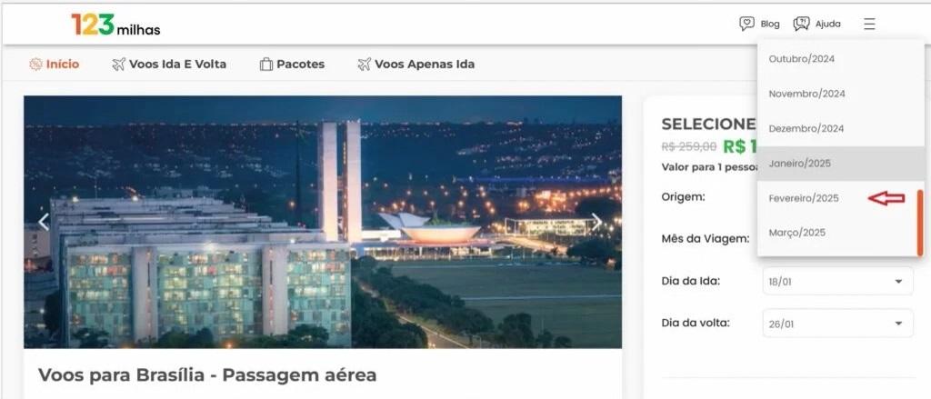 A promoções são de voos entre janeiro a março de 2025. Ao clicar na sua viagem, aparecerá a tela de compra para você escolher o mês e a data do seu voo. Para participar da promoção, escolha o mês que pretende viajar no primeiro trimestre de 2025.