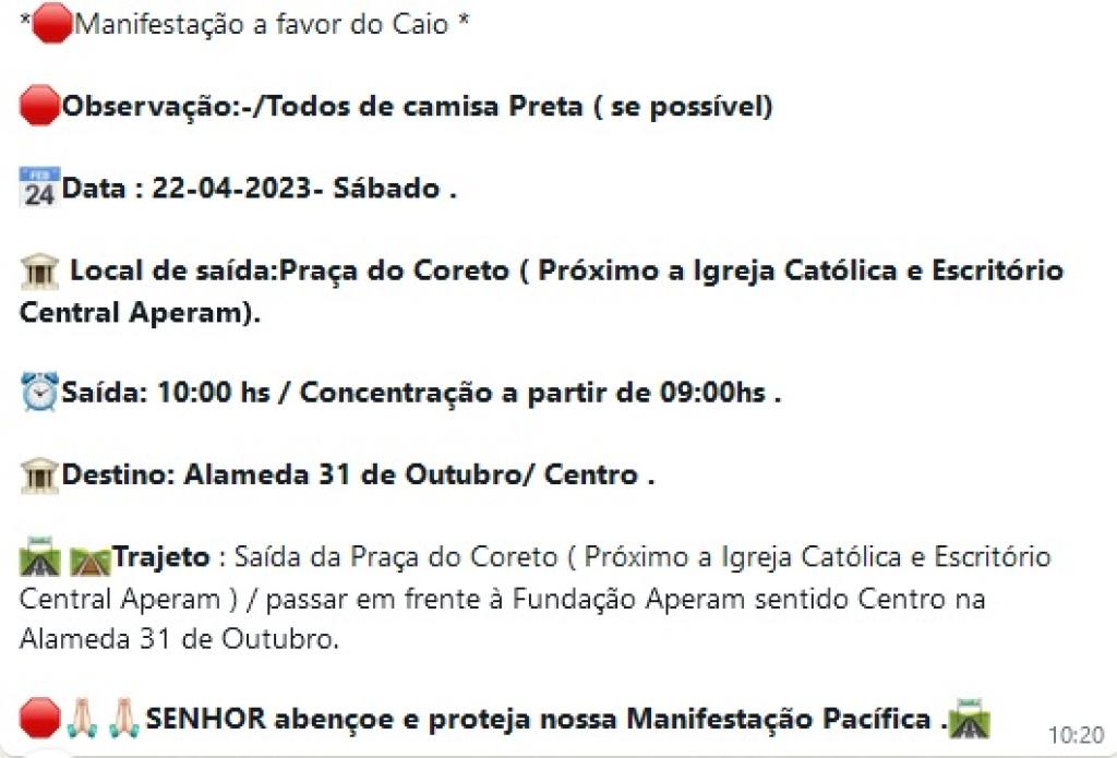 21 de abril, 2023 | 13:33Olha, sugiro que essa manifestação seja feita em frente ao fórum, e em dia de expediente.”