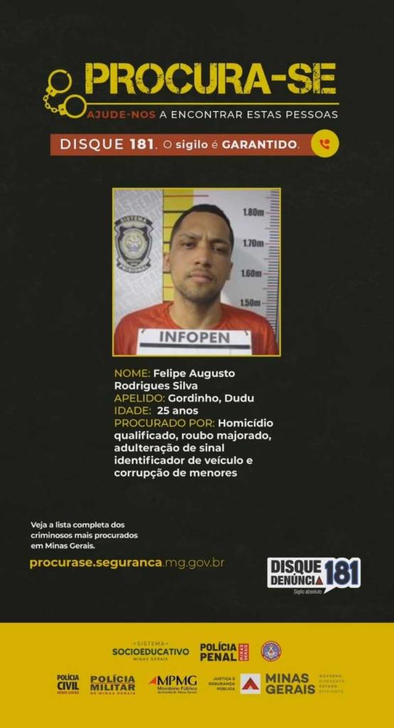 O Procura-se é coordenado pela Sejusp em parceria com a Polícia Civil, a Polícia Militar, o Corpo de Bombeiros Militar, a Polícia Penal, o Sistema Socioeducativo, o Ministério Público e o Tribunal de Justiça de Minas Gerais (TJMG), e tem como objetivo realizar a prisão de indivíduos foragidos da Justiça, a partir de ações qualificadas das polícias, das Agências de Inteligência e da participação do cidadão, por meio de denúncias ao Disque Denúncia Unificado 181. Para saber mais sobre os alvos acesse procurase.seguranca.mg.gov.br.