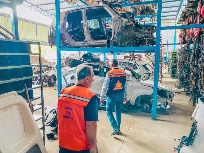 Agentes de Combate a Endemias e da Defesa Civil percorreram os estabelecimentos para fiscalizar o armazenamento das peças, especialmente em áreas descobertas, a limpeza dos ambientes e o descarte de objetos que podem armazenar água.