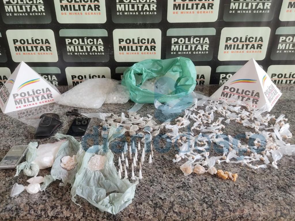 Ao todo, foram apreendidas 270 pedras de crack embaladas, prontas para serem comercializadas, 27 pinos contendo cocaína e uma sacola com a mesma droga, 30 buchas de maconha, cinco pedras grandes de crack (para serem fracionadas ao varejo), uma balança de precisão, um coldre para arma de fogo e um aparelho de celular.