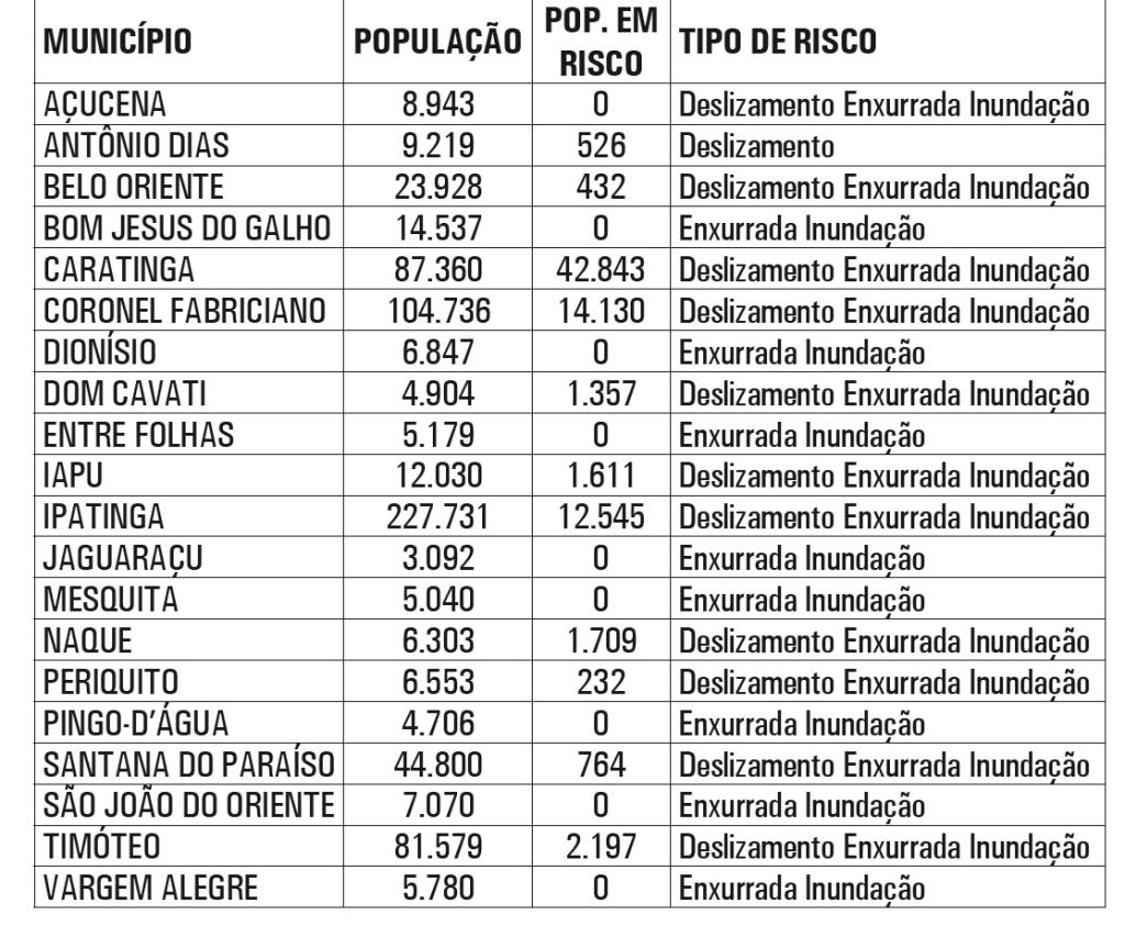 De acordo com o documento, ao qual o Diário do Aço teve acesso, do total de cidades da região, Antônio Dias, Belo Oriente, Caratinga, Coronel Fabriciano, Dom Cavati, Iapu, Ipatinga, Naque, Periquito, Santana do Paraíso e Timóteo concentram as áreas com população em situação de risco, que juntas somam 78.346 pessoas. O número é superior a toda a população de Santana do Paraíso e próxima da quantia de habitantes de Timóteo. (Veja a lista completa na tabela abaixo).