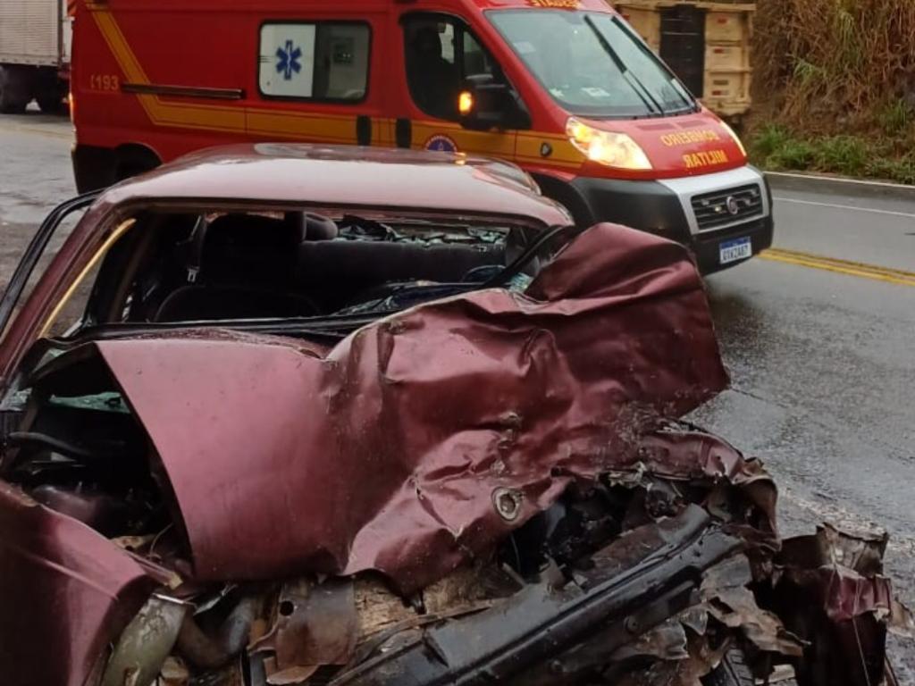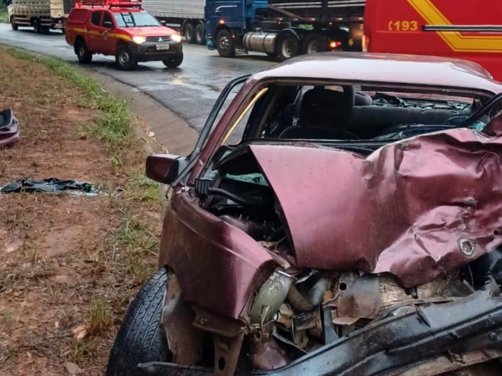 O Corpo de Bombeiros Militar foi acionado para socorrer a vítima de um acidente grave, na BR-381. O sinistro foi registrado por volta das 5h30 na manhã desta segunda-feira (5) próximo ao local conhecido como Corte de Pedras” no km 367, em São Gonçalo do Rio Abaixo e envolveu um veículo de passeio e um caminhão que tracionava uma carreta bitrem.As causas do acidente não foram definidas, mas os indícios mostram que o Chevrolet Monza rodou na pista e atingiu a lateral direita do Volvo.