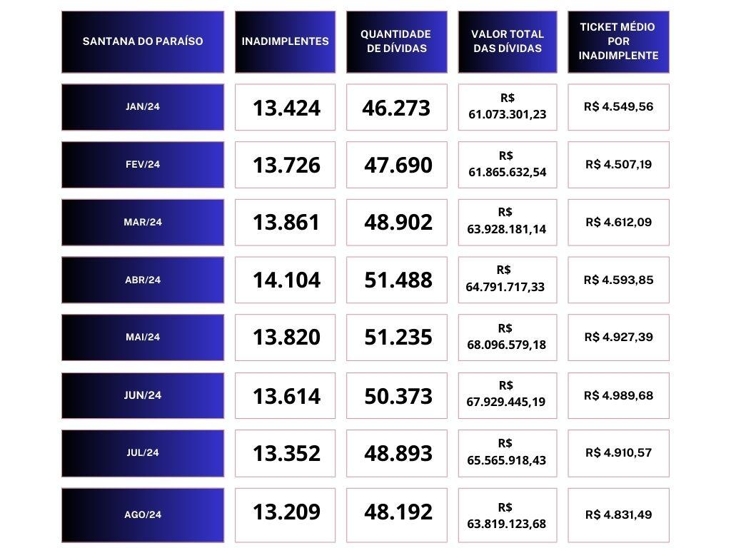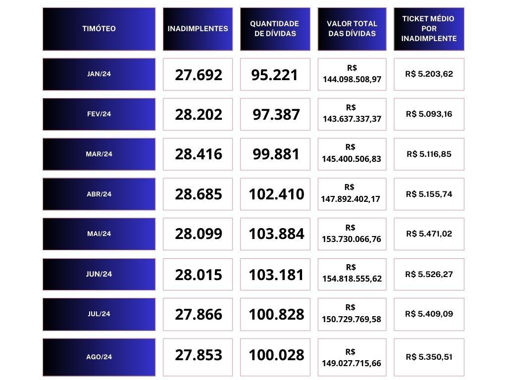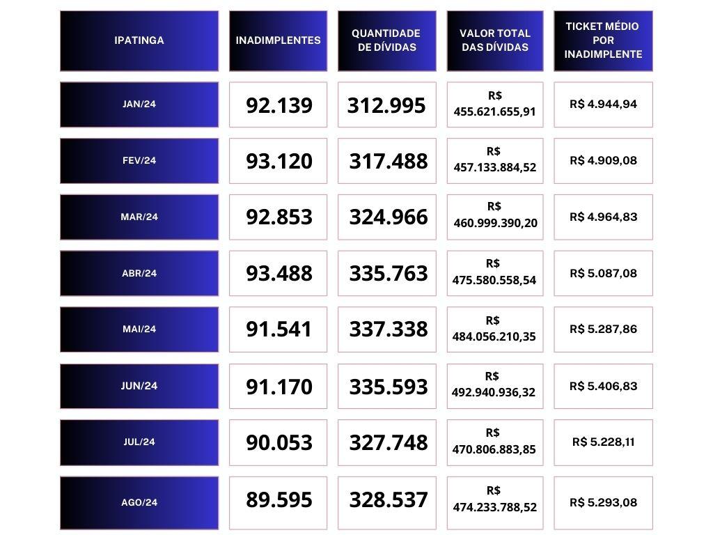 Ipatinga tinha 90.053 em julho, caindo para 89.595 em agosto. No sétimo mês do ano, Timóteo registrou um total de 27.866 endividados, reduzindo somente para 27.853 no mês seguinte. Já Santana do Paraíso contava com 13.352 inadimplentes em julho e 13.209 em agosto.