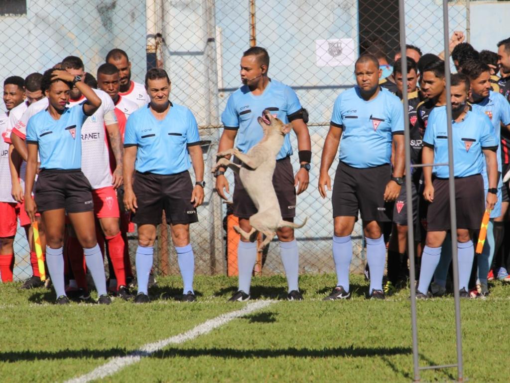 Antes de entrar em campo, o cachorro caramelo deu ''boas-vindas'' à arbitragem na decisão ipatinguense