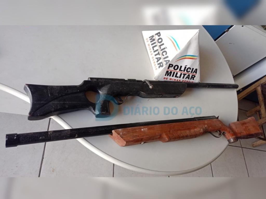 As duas armas de fabricação artesanal apreendidas durante a primeira prisão do acusadoA primeira prisão ocorreu por volta das 11h, quando a Polícia Militar foi acionada para resolver uma disputa familiar envolvendo a construção irregular em uma área de preservação ambiental, que segundo apurações da PM, a área seria do município. O filho da moradora estava com duas espingardas de fabricação artesanal, conforme informações dos familiares.