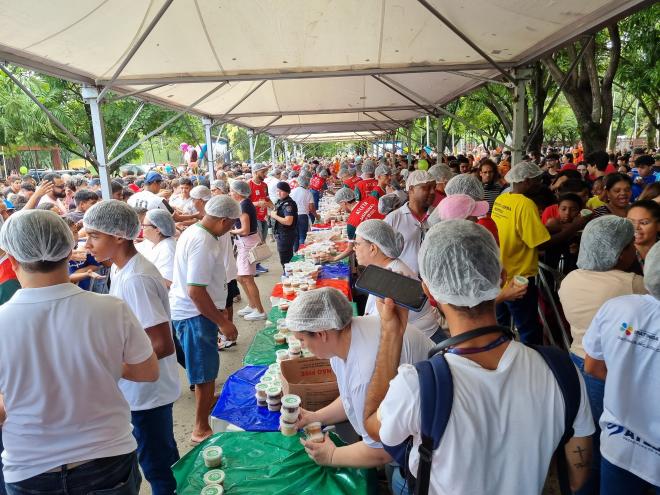 Foram entregues cerca 10 mil bolos no pote, totalizando aproximadamente 1,5 tonelada de doces com recheios variados, garantindo sabores para todos os gostos. Os bolos são produzidos por confeiteiros e microempreendedores locais, que ficam responsáveis por adoçar a festa. A ação valoriza os talentos da cidade e movimenta a economia local, gerando oportunidade e renda para quem vive do próprio trabalho.