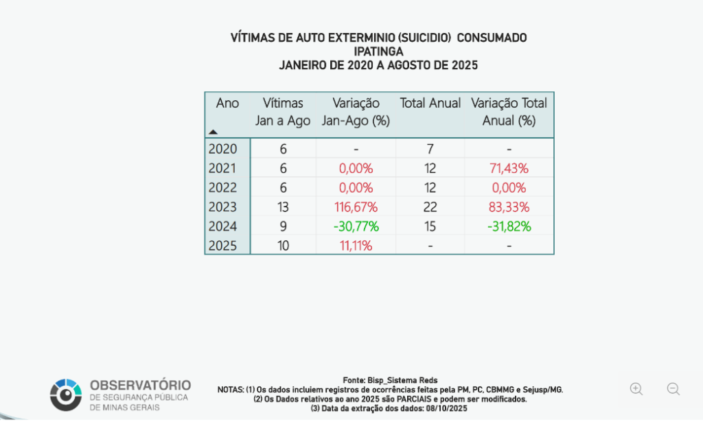 Procurado pela redação do Diário do Aço o Observatório de Segurança Pública/Reds/Sejusp MG, informou que, de janeiro de 2020 a agosto de 2025, um total de 78 pessoas cometeram autoextermínio (Suicídio) em Ipatinga. Os dados podem ser consultados na tabela enviada pela Sejups: