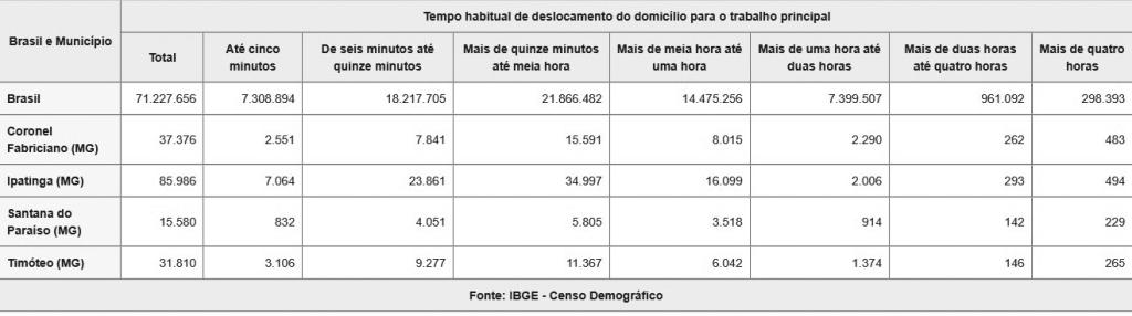 A pesquisa apresentada pelo IBGE também aponta que 40,70% das pessoas gastam mais de 15 minutos a 30 minutos para chegar ao serviço em Ipatinga. Em Coronel Fabriciano, Santana do Paraíso e Timóteo, o percentual de trabalhadores que se deslocam entre a residência e o local de trabalho nesse tempo é de 41,71%, 37,26% e 35,73%, respectivamente.
