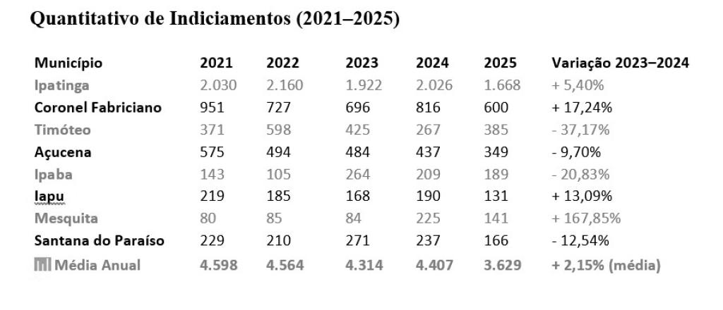 Ipatinga lidera o ranking com 2.026 indiciamentos em 2024 e 1.668 em 2025, seguida por Coronel Fabriciano, com variação positiva de 17,24% entre 2023 e 2024. Mesquita apresentou crescimento expressivo de 167,85%, enquanto cidades como Timóteo (-37,17%) e Ipaba (-20,83%) registraram redução, atribuída a flutuações operacionais e mudanças na alocação de pessoal.