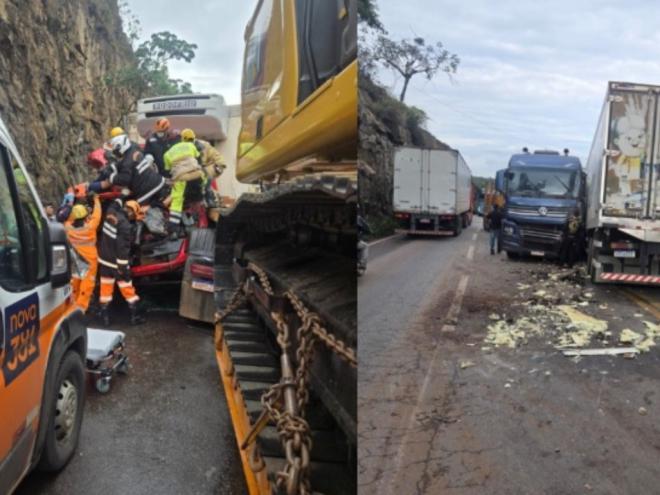Um dos sinistros mais graves ocorreu no começo da manhã, em Sabará, nas proximidades do distrito de Ravena, onde dois caminhões se envolveram em uma colisão que deixou um motorista preso às ferragens e levou à interdição total da rodovia.