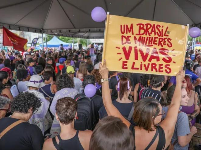 Com gritos como Feminismo é revolução” e Mulheres Vivas”, as manifestantes destacaram que a forma patriarcal” como a sociedade foi estruturada ao longo dos séculos contribui para uma espécie de epidemia” de feminicídios no Brasil.