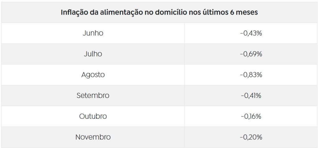 Juntos, a alimentação no domicílio e a fora do domicílio formam o grupo alimentos e bebidas, que caiu 0,01% em novembro, sendo a quinta queda nos últimos seis meses de junho a novembro, só não caiu em outubro.
