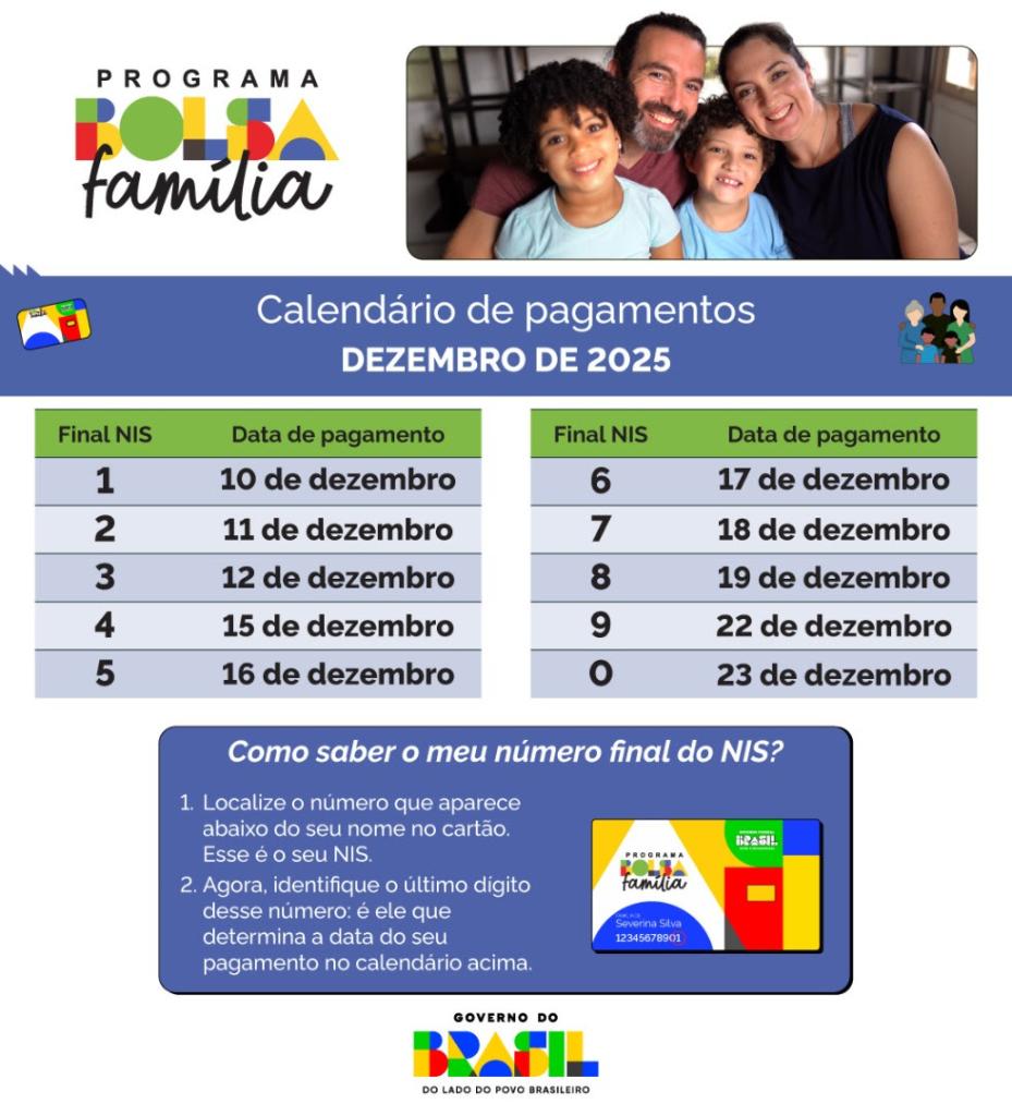 Como ocorre usualmente em dezembro, o cronograma de pagamento do Bolsa Família é ajustado para ser finalizado antes do NatalUm total de 1.410.757 famílias em todos os 853 municípios de Minas Gerais estão contempladas em dezembro com o Bolsa Família. Para isso, o investimento do Governo do Brasil no estado supera R$ 945 milhões. O valor garante um benefício médio de R$ 678,75. O cronograma de pagamentos tem início nesta quarta-feira (10), e segue até o dia 23, de acordo com o final do Número de Identificação Social NIS.