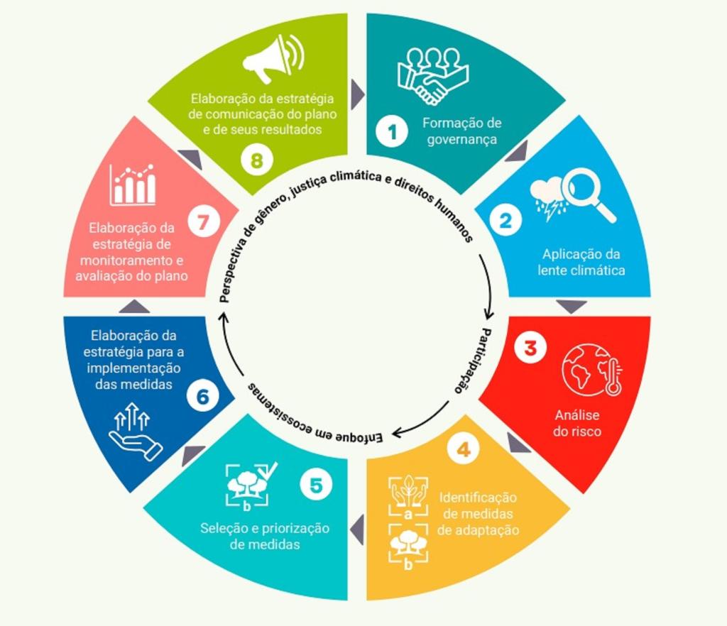 1 - Formação da Governança, quando se estabelece o modelo de governança, que deve incluir agentes públicos e privados, especialmente os grupos sociais que podem ser mais diretamente atingidos pelas mudanças climáticas.2 - Aplicação da Lente climática, ou seja, reconhecendo como a mudança climática já afeta ou pode afetar o território;