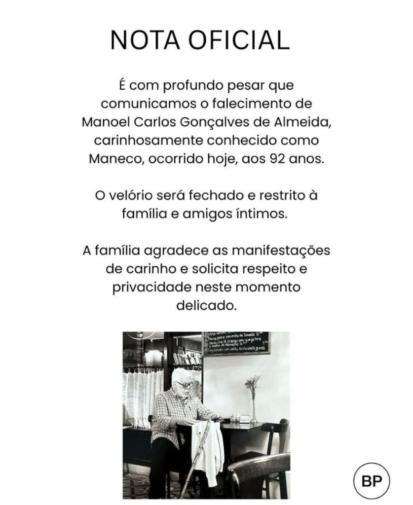 A divulgação oficial foi feita pela produtora Boa Palavra. O comunicado informava que o velório será fechado e restrito à família e a amigos íntimos.