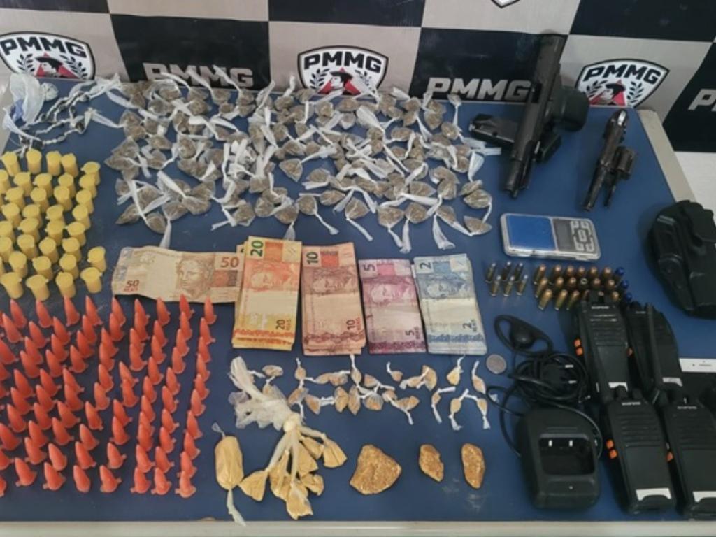 Na manhã desta terça-feira (3), foram cumpridos sete mandados de busca e apreensão a pedido do Ministério Público de Minas Gerais (MPMG), em parceria institucional com a Polícia Militar do Estado (PMMG). Na ocasião, duas pessoas foram presas. As informações foram divulgadas pelo MP.Foram apreendidos os seguintes itens: armas e munições (uma pistola .40 com um carregador e 21 munições, um revólver calibre 32 com seis munições e um coldre de pistola); drogas (112 buchas de maconha, 27 pedras de crack, uma porção grande mais 202 papelotes e pinos de cocaína, uma porção grande e 17 porções de skank para a venda); além de três celulares, quatro rádios comunicadores, um carregador de rádio, uma balança de precisão e R$ 261.