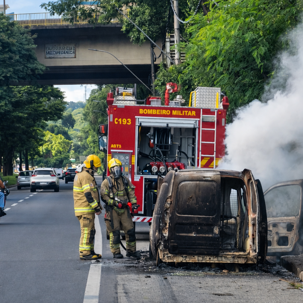 O Corpo de Bombeiros Militar foi acionado para atender à ocorrência no local do sinistro. Ao chegar, a equipe encontrou o veículo já tomado pelas chamas. Tratava-se de um Renault Kangoo.
