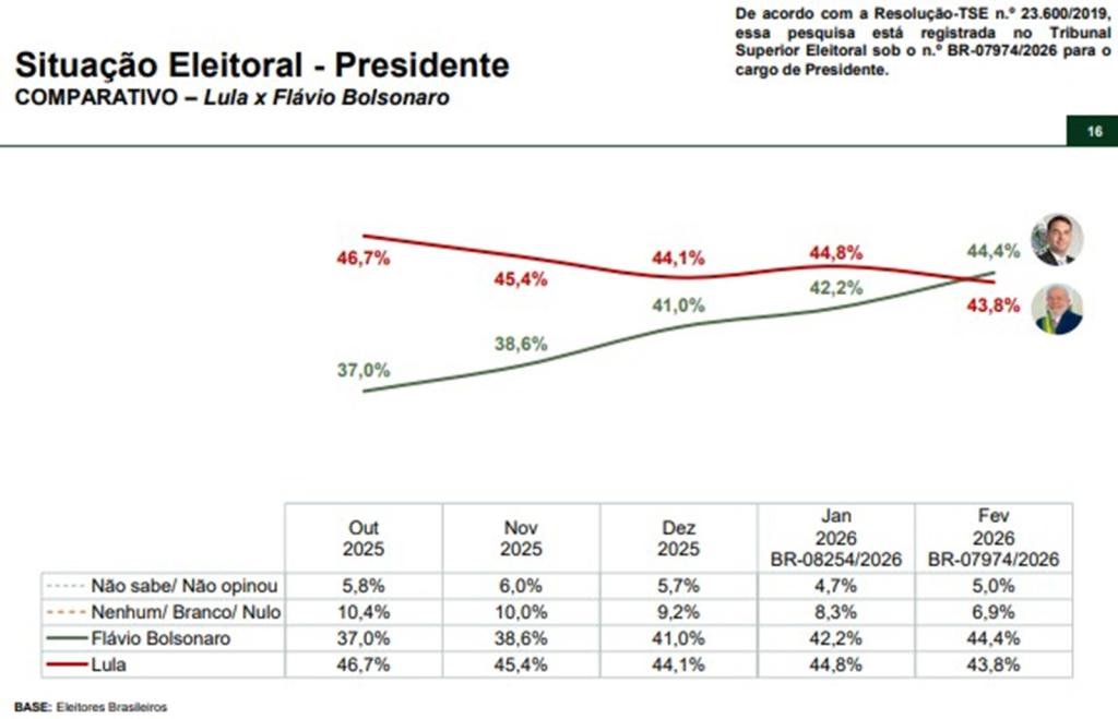 Na comparação com levantamento anterior, divulgado em janeiro de 2026 pelo mesmo instituto, Lula apresentou oscilação negativa de um ponto percentual, passando de 44,8% para 43,8%. Já Flávio Bolsonaro oscilou positivamente, de 42,2% para 44,4%.