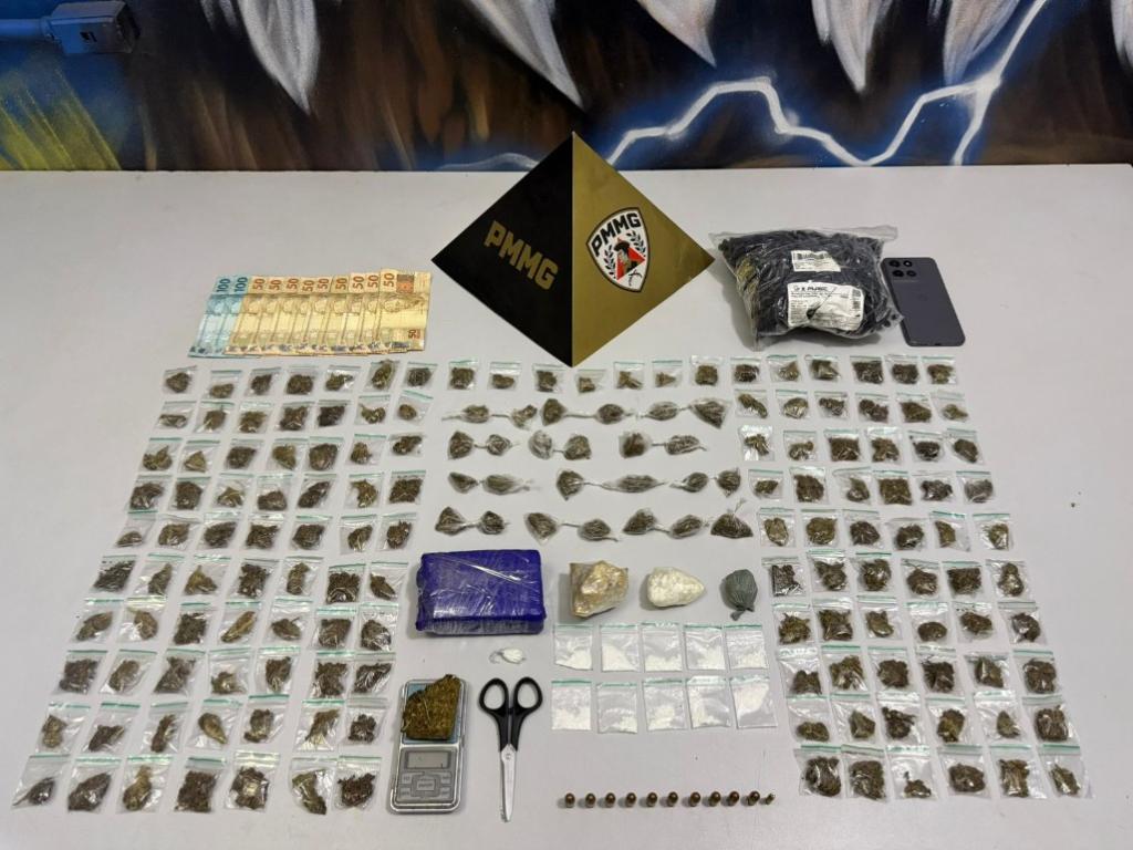 Na sacola dispensada, foram localizadas diversas porções de substâncias semelhantes à maconha, cocaína e crack, além de uma barra fracionada de maconha, balança de precisão, materiais para dolagem e munições de calibres .380 e .22. Com o autor também foram apreendidos dinheiro em espécie e um aparelho celular.