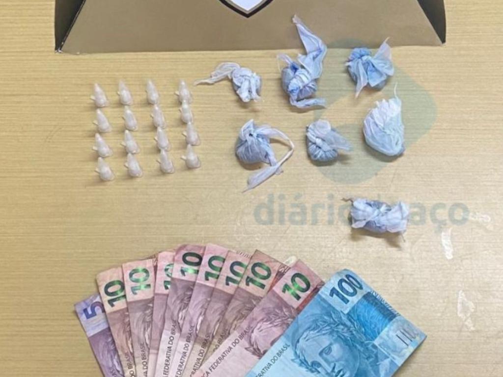 Ao todo, foram apreendidas sete buchas de maconha e 16 pinos de cocaína, além de R$ 10 com o adolescente A.R.F.H.A. e R$ 30 com S.C.G.M.