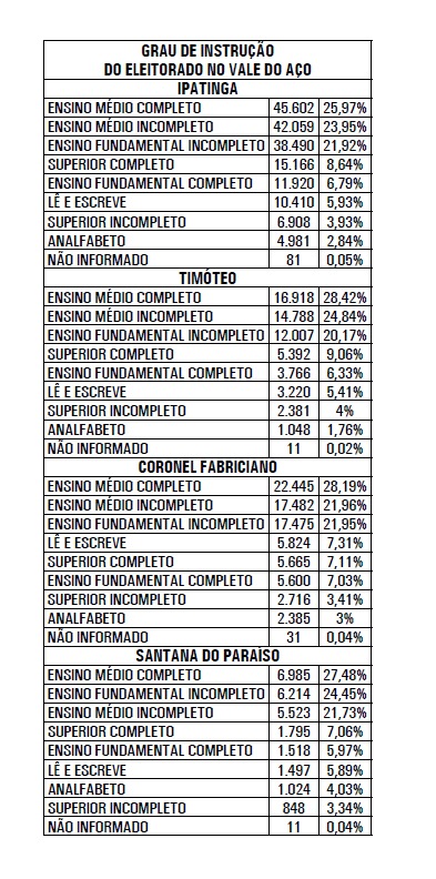 Em Ipatinga, maior colégio eleitoral da região com 175.617 votantes, os eleitores com ensino médio completo representam 25,97%, sendo o maior percentual entre as categorias. Situação semelhante é observada em Timóteo (28,42%), Coronel Fabriciano (28,19%) e Santana do Paraíso (27,48%), onde esse nível de escolaridade também aparece como predominante.