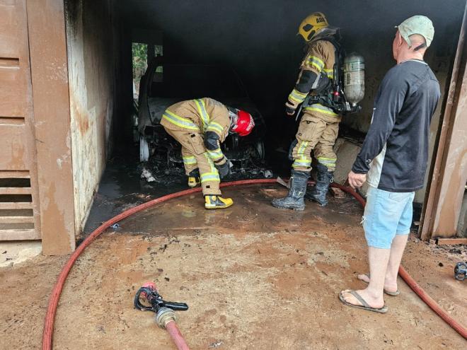 Um incêndio atingiu a garagem de uma residência e um veículo de passeio na rua Taquara, no bairro Potyra, na região do Caladão, em Coronel Fabriciano
