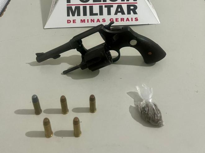 Um jovem de 21 anos e uma jovem de 20 foram detidos e conduzidos para a Delegacia de Polícia por posse ilegal de arma de fogo e entorpecentes